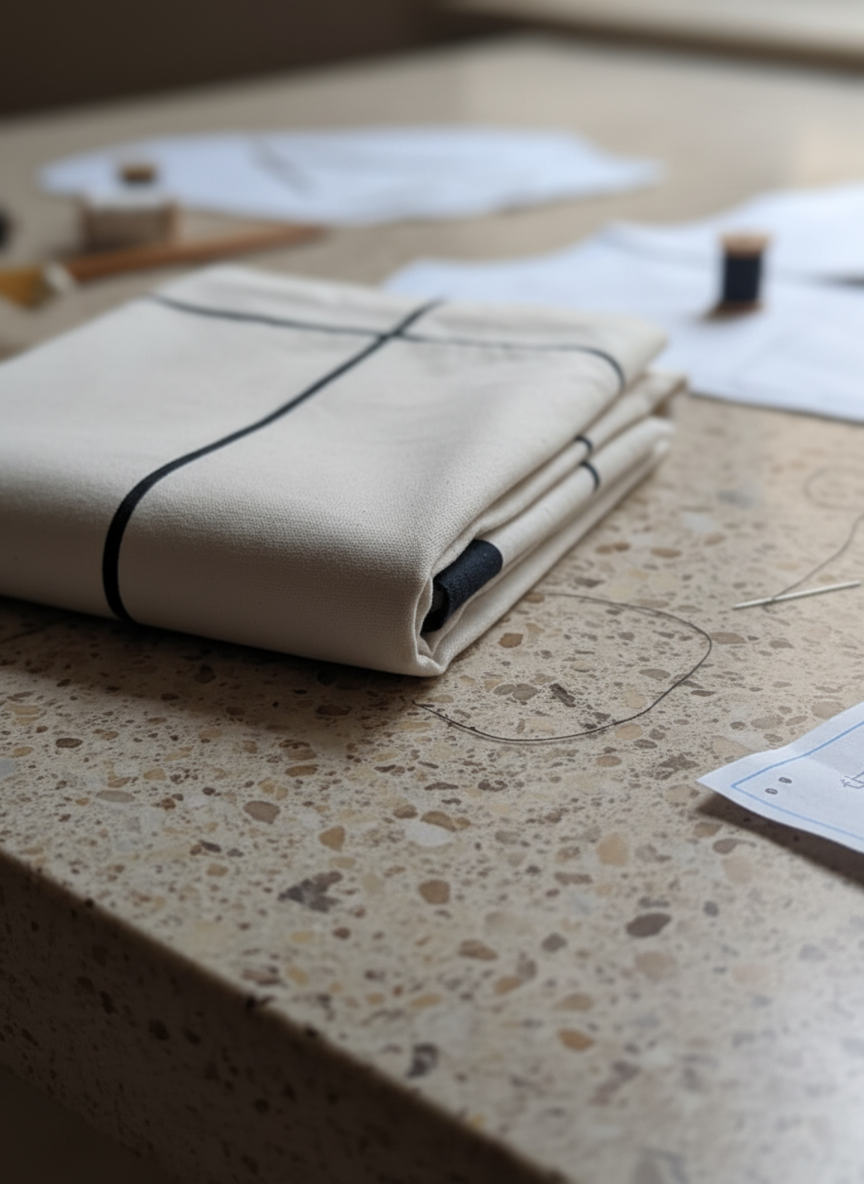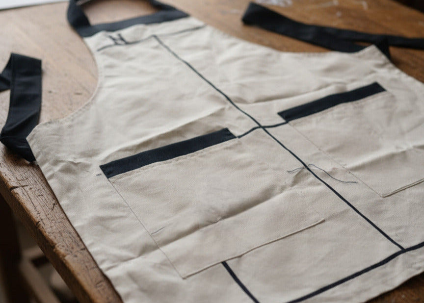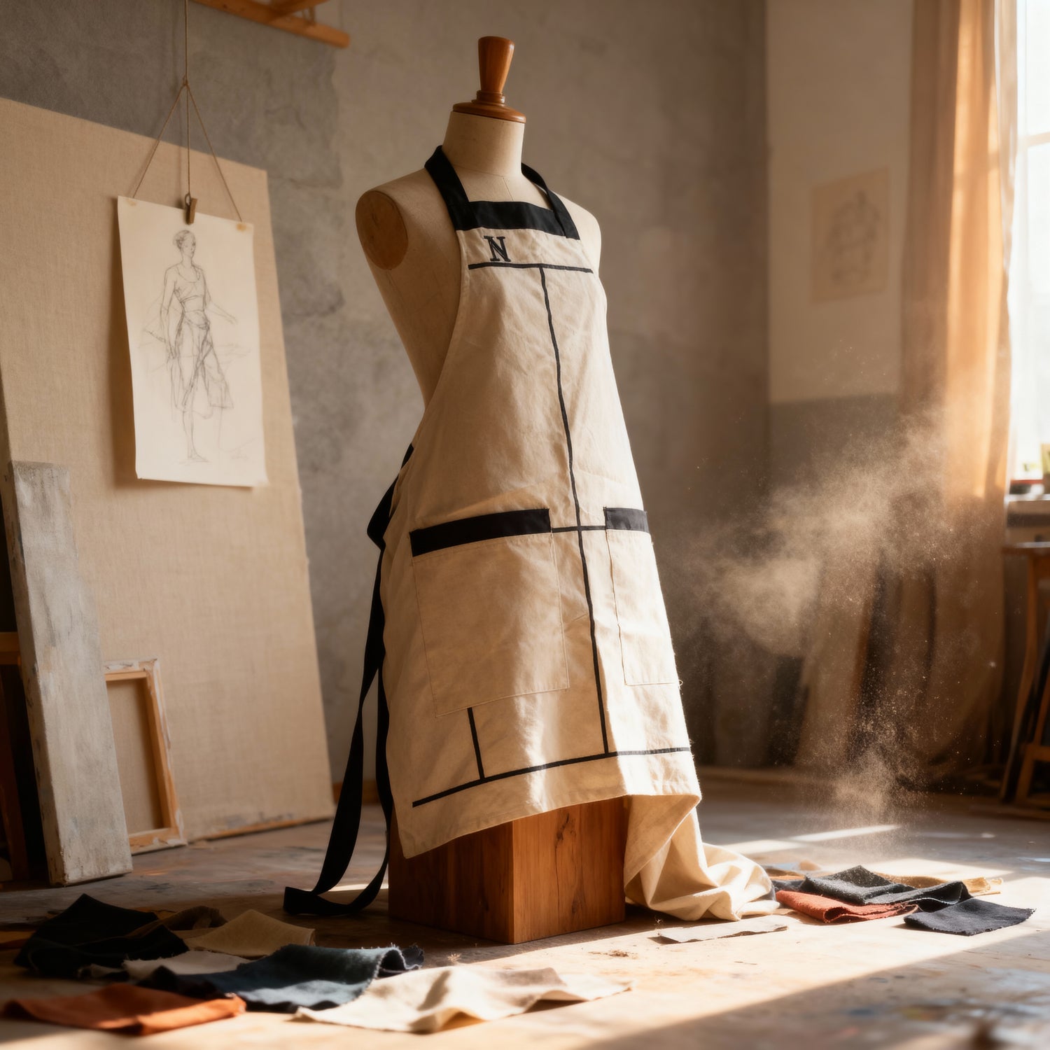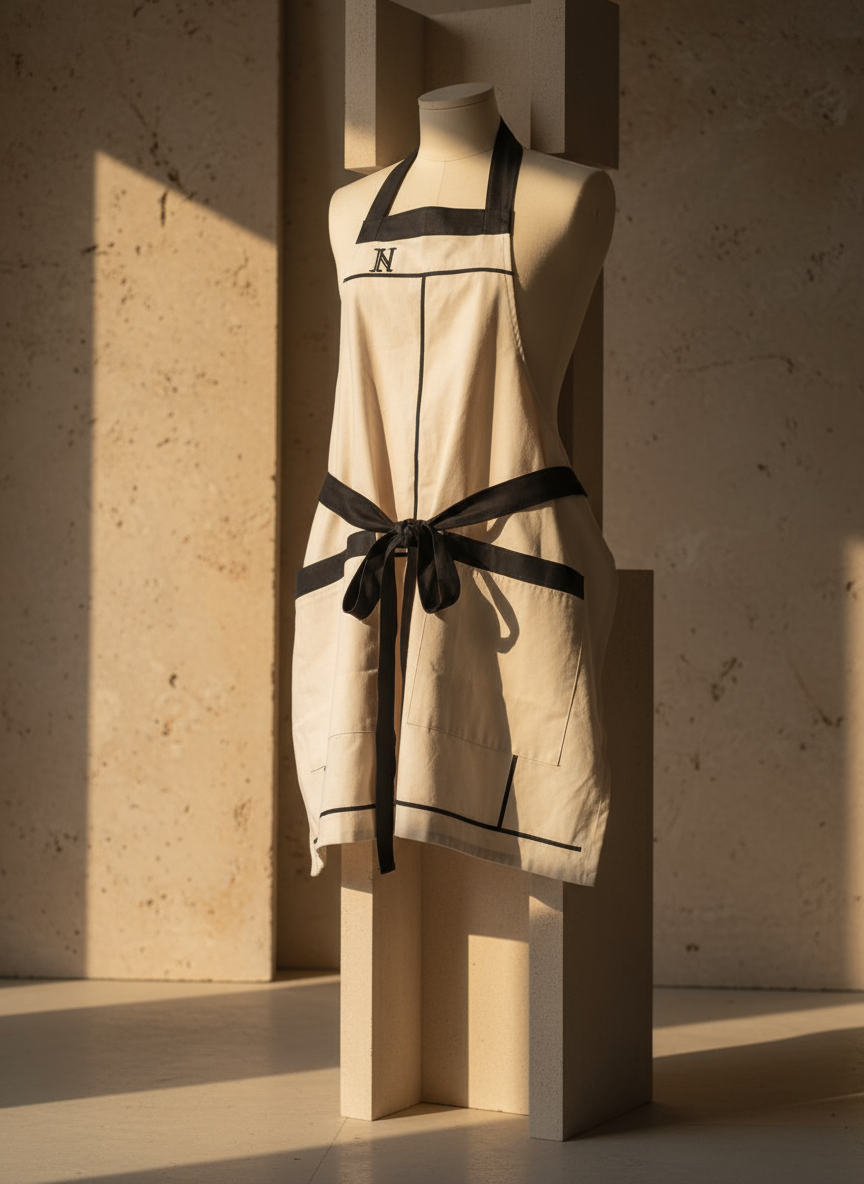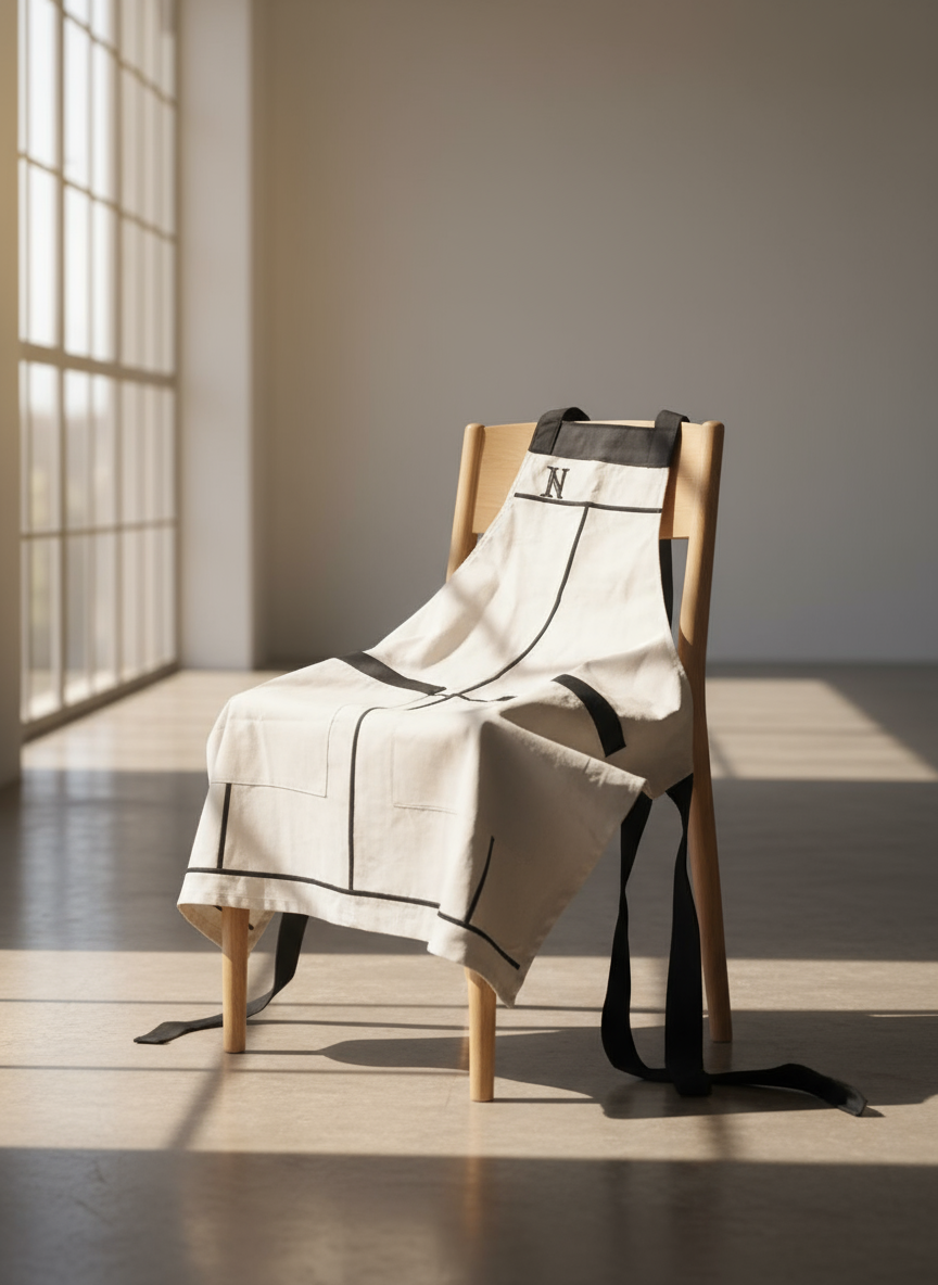 Beauty here is not decoration, but proportion, tension, and space , the same forces that shape buildings. Our aprons are deliberately unusual, because they are designed not to blend in, but to stand as objects of thought and form.